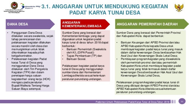 Pedoman Umum Pelaksana Padat Karya Tunai Didesa Tahun 2018 from image.slidesharecdn.com Padat karya tunai (cash for work) merupakan kegiatan pemberdayaan masyarakat desa khususnya yang miskin dan marginal yang bersifat produktif dengan mengutamakan pemanfaatan sumber daya, tenaga kerja, dan teknologi lokal untuk memberikan tambahan upah/ pendapatan, meningkatkan daya beli, mengurangi kemiskinan, dan sekaligus mendukung penurunan angka stunting. See full list on id.wikipedia.org Semoga ekonomi desa meningkat berkat program padat karya tunai | presiden republik indonesia. ^ a b padat karya tunai di desa | situs resmi kementerian koordinator bidang pembangunan manusia dan kebudayaan. Pertama, rancangan anggaran pendapatan dan belanja desa disusun berdasarkan rencana kerja pemerintah desa, lalu diperlihatkan kepada kabupaten/kota maupun desa. Bahwa penyusunan dokumen rencana kerja pemerintah desa ( rkpdes ) disusun awal juli sampai september tahun berjalan. Gak masuk akal banget kan !! Kumpulkan data rtm dan mulailah mendata.